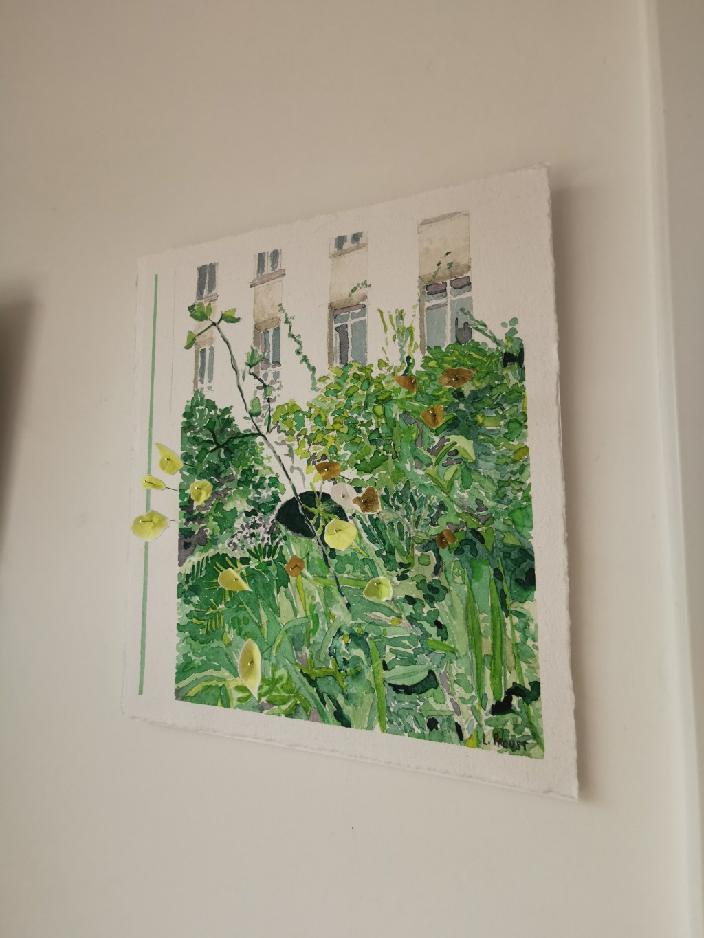 Cette série commence par une collection de photos faites un peu partout autour de chez moi. Je cherche à composer avec les couleurs et le relief pour la faire vibrer la peinture. À la lumière représentée se superposent les ombres…