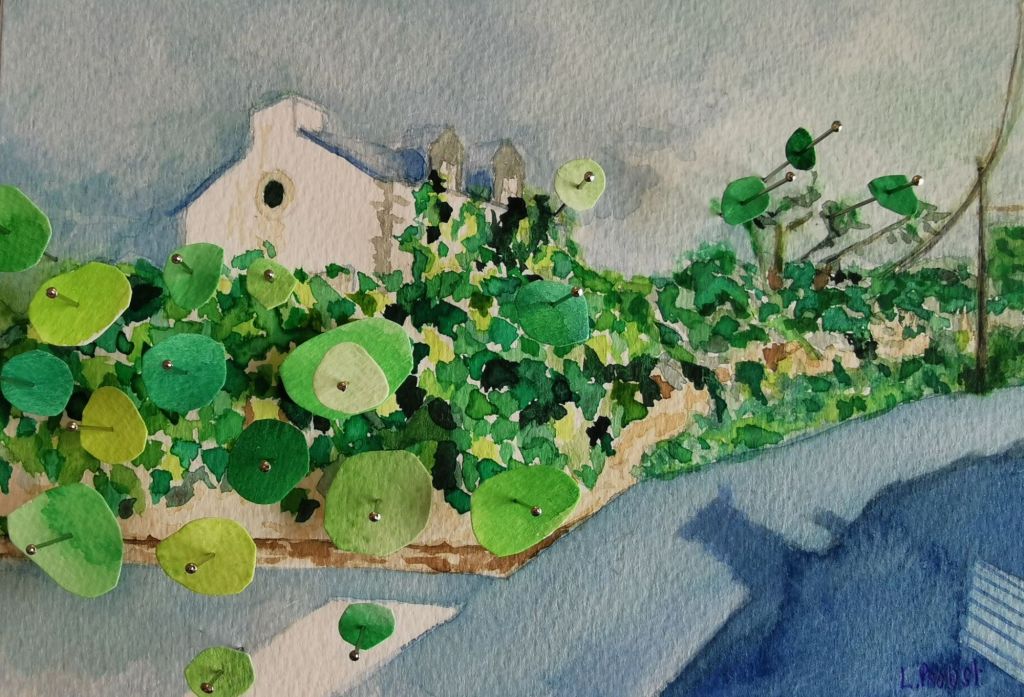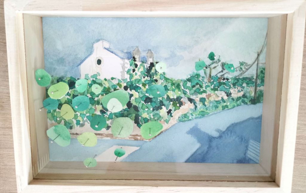 Maison d’Audrey, 2025, 13,5 x 20,5 x 3 cm, aquarelle, épingle, carton plume 70 eurosDétail de plante, 2025, 18 x 12,5 x 3 cm, aquarelle, épingle, carton plume, 40 eurosÎle aux moines, 2025, 16,5 x 11,5 cm, aquarelle, épingles, carton plume, 60 euros